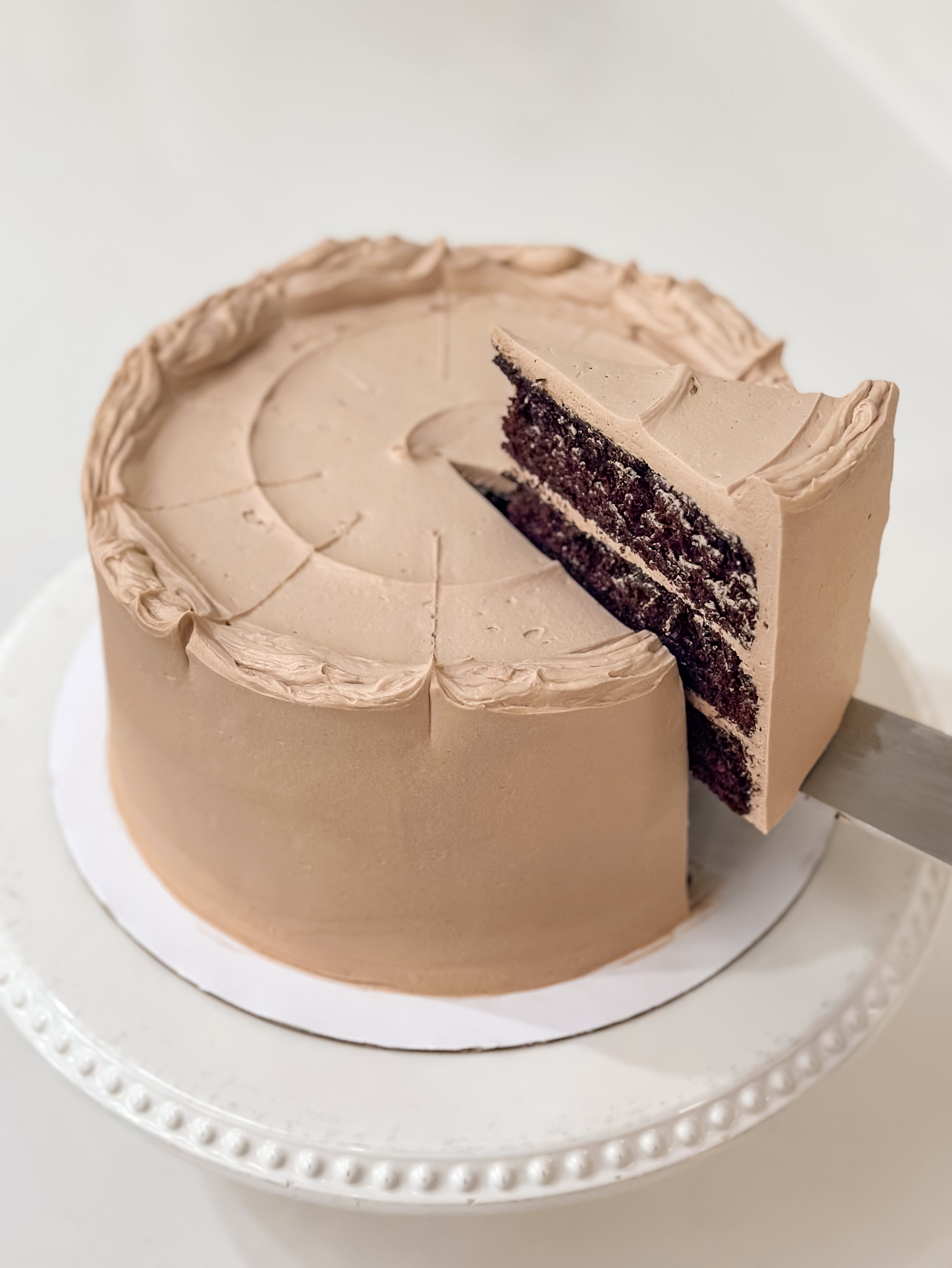 Our Devil's Food Chocolate Cake is ultra moist and fluffy, covered in a creamy Buttercream of your choice.